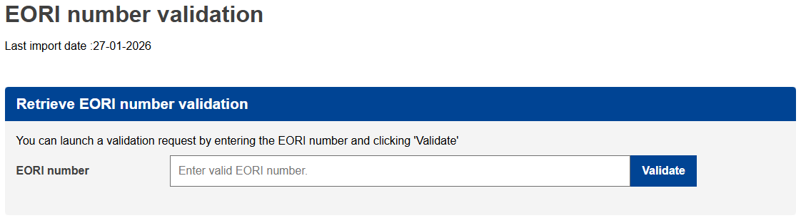 You can launch a validation request by entering the EORI number and clicking 'Validate'